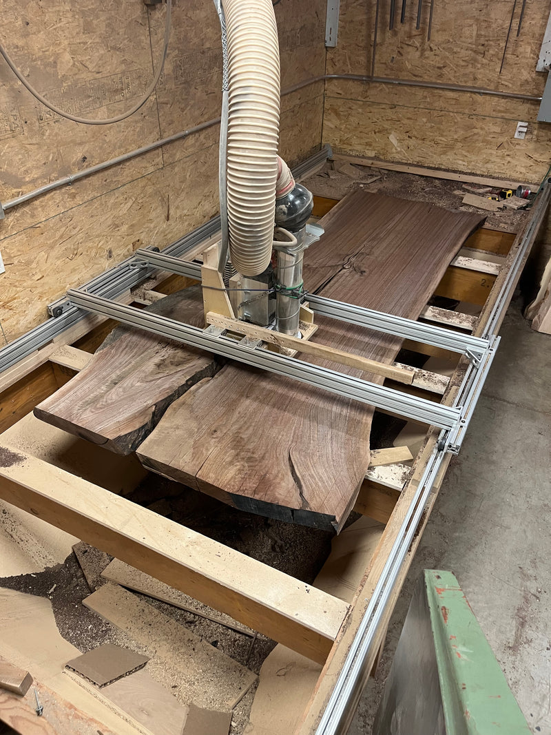 Our manual CNC router sled can flatten up to 56" wide and 12' long. We charge by hour and can typically finish both sides of a 4x8' slab in just over an hour. Cases like metal in the slab, epoxy, twist amount, wood species, can all change affect the rate we finish a slab. Once finished on the flattener we highly recommend finishing on the belt sander to remove the aggressive router marks although they can be sanded out by hand.